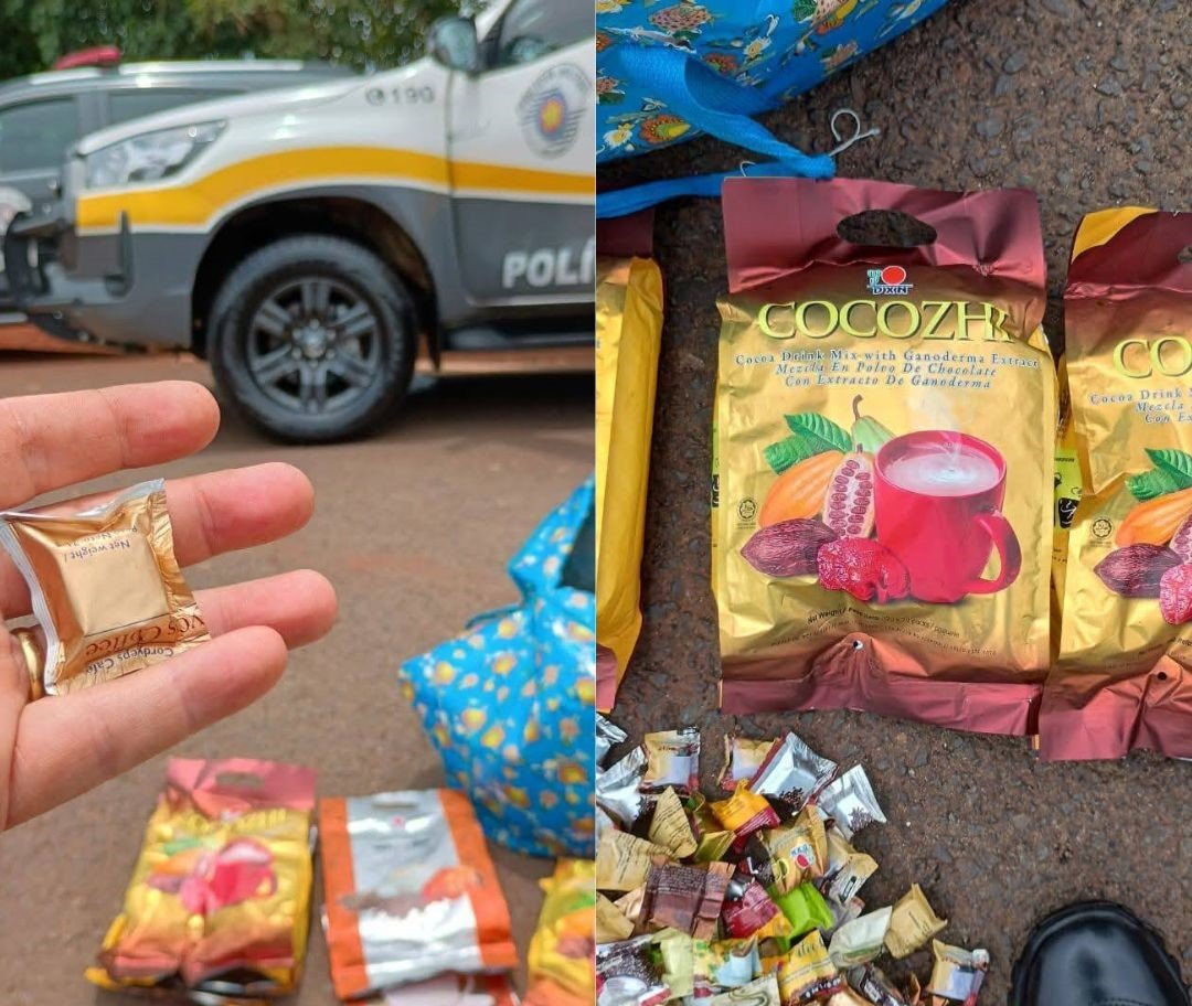 Na presença da proprietária, a mala foi aberta, e dentro foram localizados 07 pacotes de chocolate em pó contendo, em seu interior, pequenas embalagens com pasta base de Cocaína, pesando 4,320 kg.